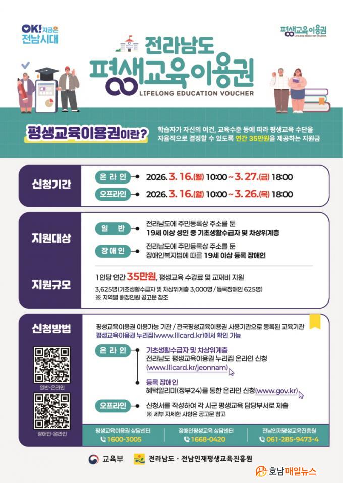 ÀÌ¿ë±Ç ½ÅûÀº Àü³²µµ Æò»ý±³À°ÀÌ¿ë±Ç ´©¸®Áý(www.lllcard.kr/jeonnam¡¤Àú¼ÒµæÃþ ´ë»ó)°ú º¸Á¶±Ý24(www.gov.kr¡¤µî·ÏÀå¾ÖÀÎ ´ë»ó), °¢ ½Ã±º Æò»ý±³À° ´ã´ç ºÎ¼¿¡¼ ÇÒ ¼ö ÀÖ´Ù.