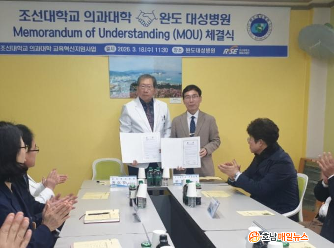 | | Á¶¼±´ëÇб³ Àǰú´ëÇÐ(¿À¸¥ÂÊ ¾È¿µÁØ ÇÐÀå)-¿Ïµµ´ë¼ºº´¿ø(¿ÞÂÊ ÀüÀÌ¾ç ¿øÀå) MOU ü°á½Ä |