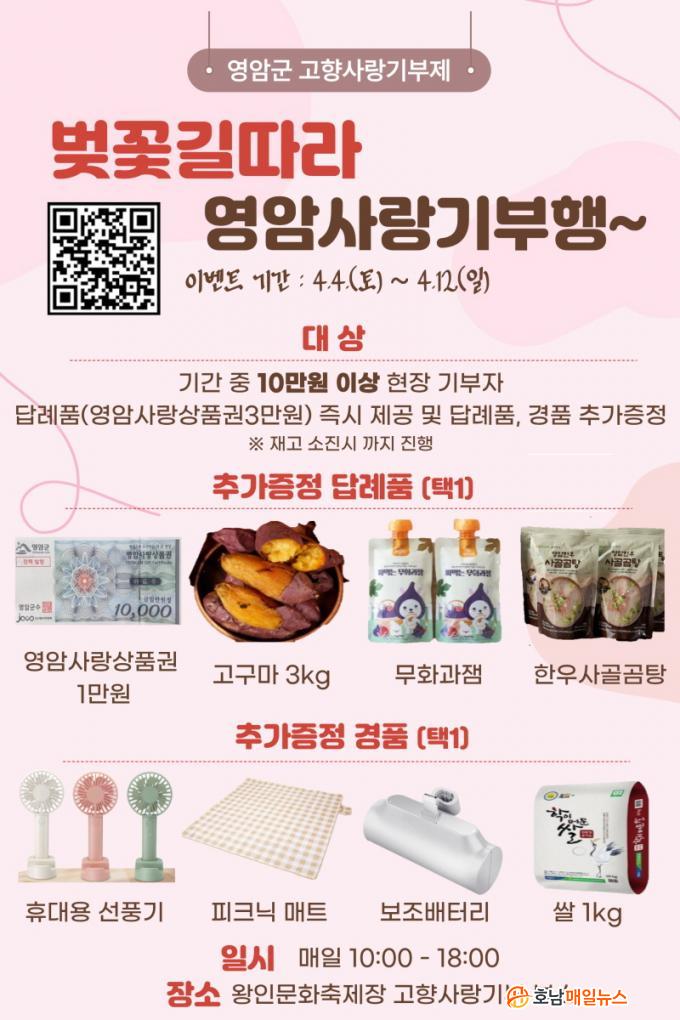 ÀÌ¿Í ÇÔ²² ÃàÁ¦ ±â°£ÀÎ 4¿ù 4ÀϺÎÅÍ 12ÀϱîÁö ÃàÁ¦Àå ³» °íÇâ»ç¶û±âºÎ ºÎ½º¿¡¼´Â ÇöÀå ±âºÎ À̺¥Æ®µµ ¿î¿µµÈ´Ù. ÇöÀå¿¡¼ ±âºÎ¿¡ Âü¿©ÇÒ °æ¿ì ±âÁ¸ ´ä·Êǰ¿¡ ´õÇØ Ãß°¡ ÁõÁ¤Ç°À» ¹ÞÀ» ¼ö ÀÖ´Ù.