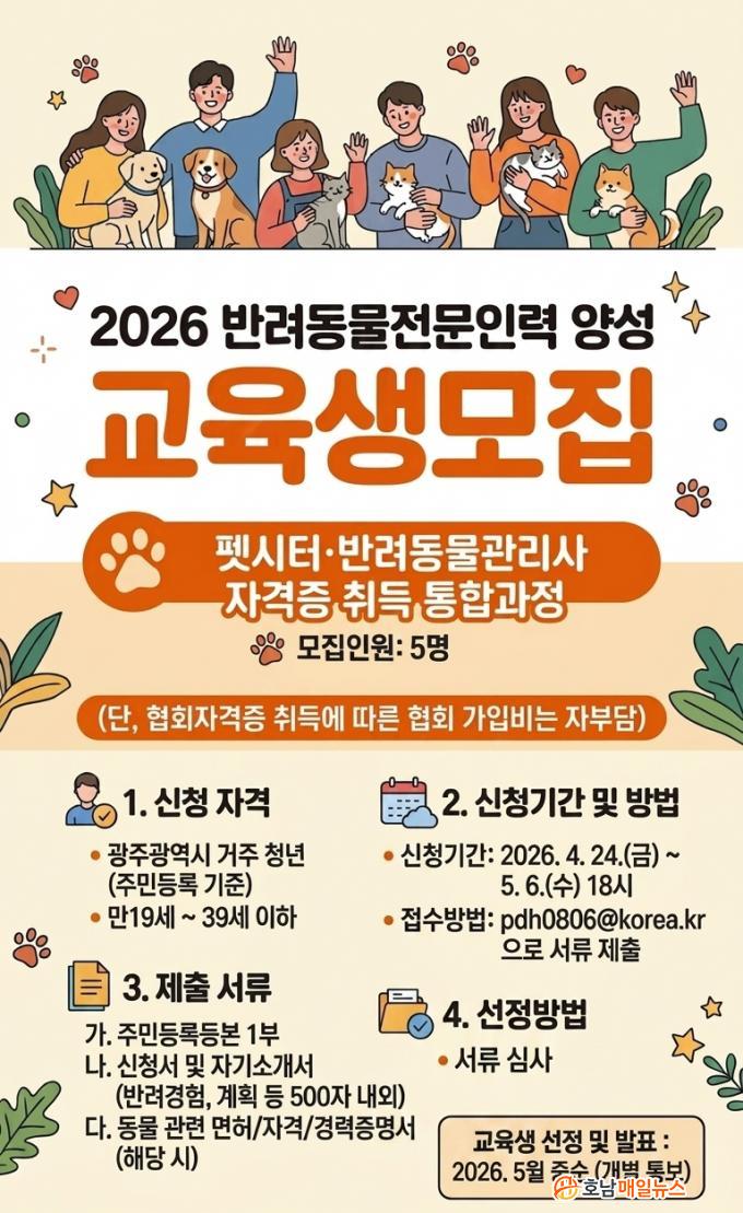 Æê½ÃÅÍ¡¤¹Ý·Áµ¿¹°°ü¸®»ç ÀÚ°ÝÁõ Ãëµæ ÅëÇÕ°úÁ¤Àº ±¤Áֽÿ¡ °ÅÁÖÇÏ´Â 19¡39¼¼ û³â 5¸íÀ» ¿À´Â 5¿ù6ÀϱîÁö ¸ðÁýÇÑ´Ù. ÀÚ¼¼ÇÑ ³»¿ëÀº ±¤ÁÖû³âÅëÇÕÇ÷§Æû¿¡¼ È®ÀÎÇÒ ¼ö ÀÖÀ¸¸ç, Âü¿©¸¦ Èñ¸ÁÇϴ û³âÀº Áֹεî·Ïµîº»¡¤½Åû¼¡¤ÀÚ±â¼Ò°³¼ µîÀ» ±¸ºñÇØ ÀüÀÚ¿ìÆí(pdh0806@korea.kr)À¸·Î Á¢¼öÇÏ¸é µÈ´Ù. ±¤Áֽô ¼·ù ½É»ç¸¦ °ÅÃÄ 5¿ù Áß ÃÖÁ¾ ±³À°»ýÀ» ¼±Á¤, °³º° Å뺸ÇÑ´Ù. ÀÚ°ÝÁõ Ãëµæ¿¡ ÇÊ¿äÇÑ ±³À°ºñ´Â ±¤Áֽð¡ Àü¾× Áö¿øÇÑ´Ù.